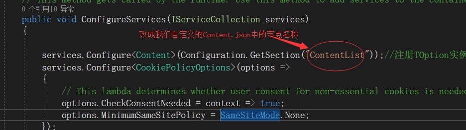 services.Configure<Content>(Configuration.GetSection("Content"));//注册TOption实例对象