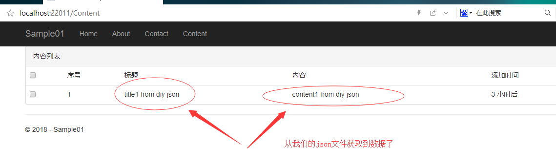 7.按下F5运行下,然后导航到Content目录看到如下页面:说明成功从appsettings.json这个文件中加载了内容。这一切是怎么发生的呢?下面我们就一步一步的来分析。