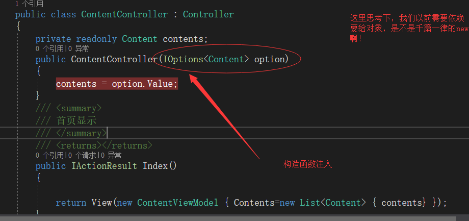 如果大家仔细阅读文章的话,相信已经看出来了,我上面提到过好几次依赖注入的概念。那么究竟什么是依赖注入呢?下面我们就拿我们上面的ContentController来好好的来理解下。
