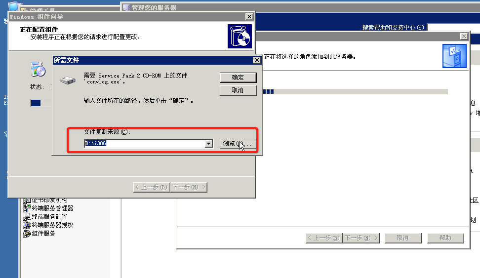 如果在安装过程中,提示您以下的信息,请插入您的windows 2003安装光盘或者虚拟光驱中的windows2003镜像,选择旁边的 浏览 按钮,找到i386文件夹,然后点击确定。