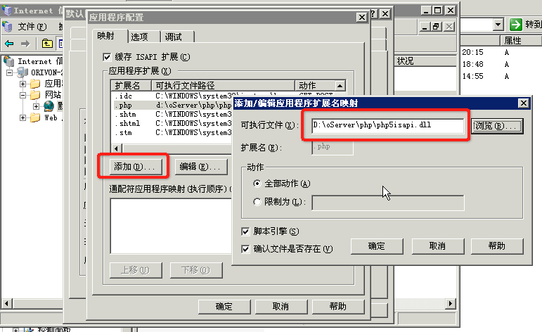 在弹出的窗口中:扩展名填写“.php”,然后点击添加按钮,浏览php安装包下的php5isapi.dll文件,点击确定。然后选中 设置扩展状态位允许。设置完成后,