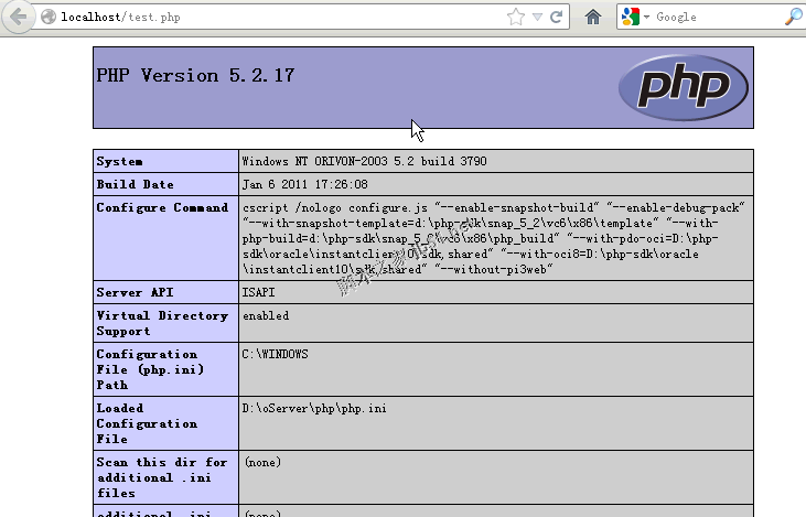 在浏览器中输入http://localhost/test.php,如果出现如下界面,表明安装成功!