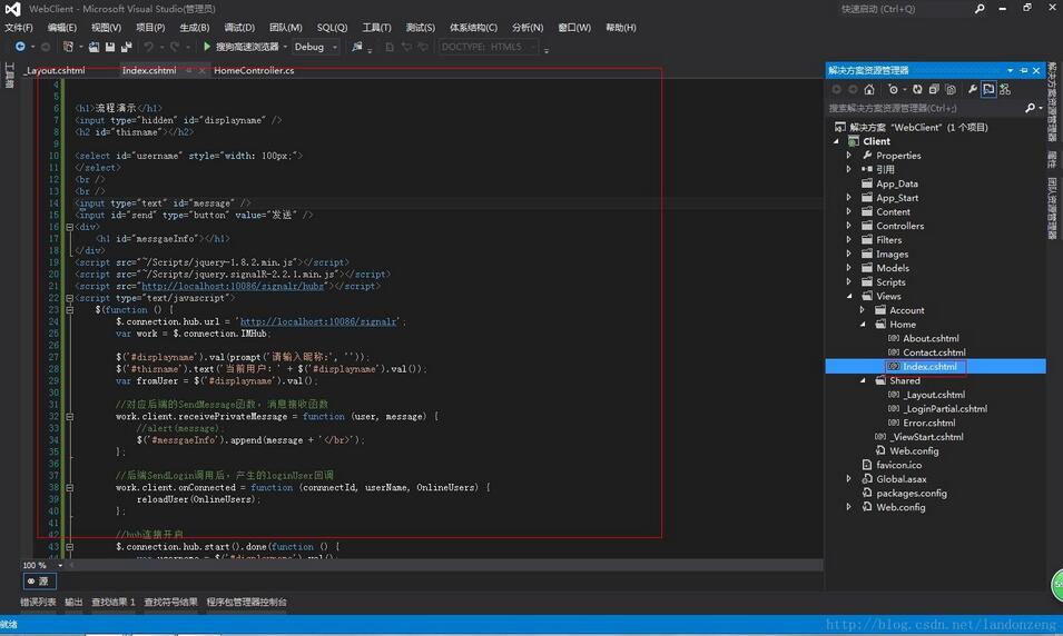 5、修改项目中Views下Homge文件夹中的Index.cshtml文件代码,如下