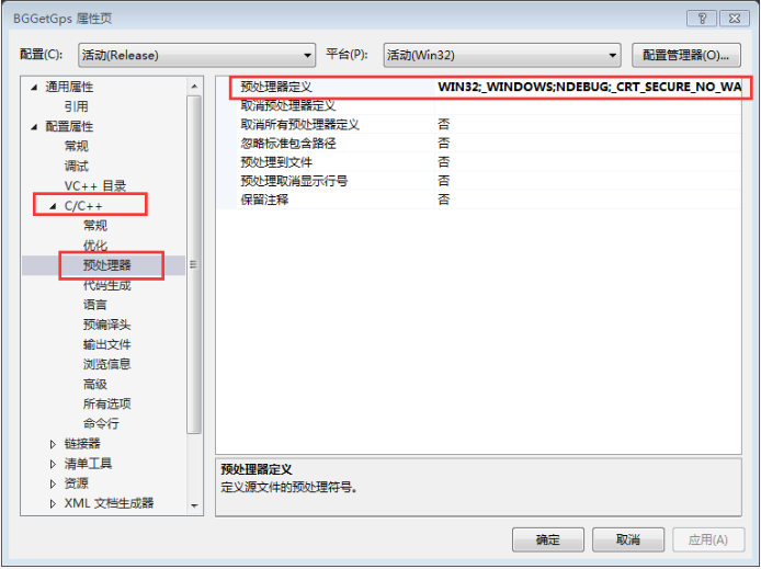 6、在工程项目设置一下就行:将报错的那个宏定义放到:项目属性—–C/C++—-预处理器 ——预处理器定义