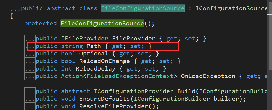 对于AddJsonFile扩展方法来添加JSON文件名,文件路径已经通过SetBasePath()方法来实现,一切配置都是基于IConfigurationBuilder接口,其中就有一个JsonConfigurationSource类,实现如下: