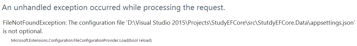 上述添加JSON文件皆可,我发现添加JSON文件必须设置JSON文件所在的目录即必须首先要设置SetBasePath方法,否则会报如下错误: