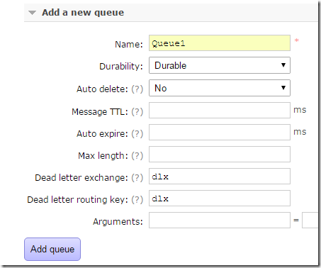 第一步, 首先需要创建2个队列。Queue1和Queue2。Queue1是一个消息缓冲队列,在这个队列里面实现消息的过期转发。如下图,设置Dead letter exchange和Dead letter routing key。设置这两个属性就是当消息在这个队列中expire后,采用哪个路由发送。这个dlx的exchange需要事先创建好,就是一个普通的exchange。由于我们还需要向Queue1发送消息,那么还需要创建一个exchange,并且和Queue1绑定。例子中,exchange同样取名:queue1。
