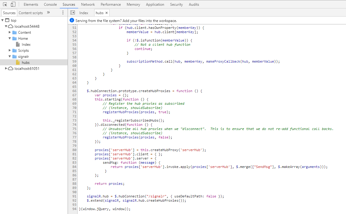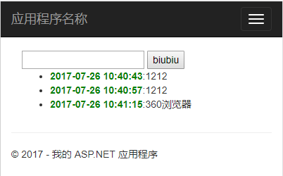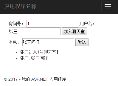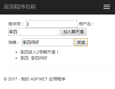运行程序的时候,Web页面就与SignalR的服务建立了连接,具体的建立连接的代码就是:$.connection.hub.start()。这句代码的作用就是与SignalR服务建立连接,后面的done函数表明建立连接成功后为按钮注册了一个click事件;也可以用集线器对象chat.connextion.start()