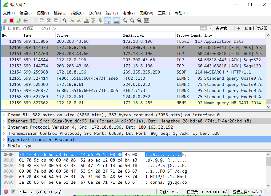 2、端口过滤:tcp.port==80,这条规则是把源端口和目的端口为80的都过滤出来。使用tcp.dstport==80只过滤目的端口为80的,tcp.srcport==80只过滤源端口为80的包;