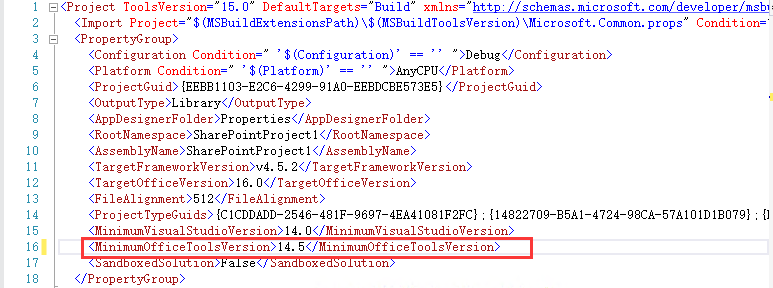 右键-编辑.csproj,把MinimumOfficeToolsVersion的值从14.5修改为14.0,重新加载项目就可以了。