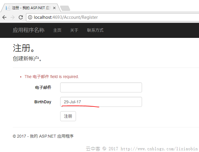 <input name= "BirthDay" class = "form-control" id= "BirthDay" type= "text" value= "" data-val-required= "Birthday must be input!" data-val= "true" data-val-date= "字段 BirthDay 必须是日期。" >