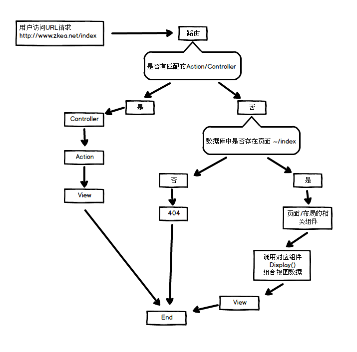 优先级最低的“全捕捉”路由是用来处理用户自行创建的页面的。当请求进来时,先去数据库中查找是否存在该页面,不存在则返回404。找到页面之后,再找出这个页面所有的组件、内容,然后统一调用各个组件的“Display"方法来来得到对应的“ViewModel"和视图"View",最后按照页面的布局来显示。