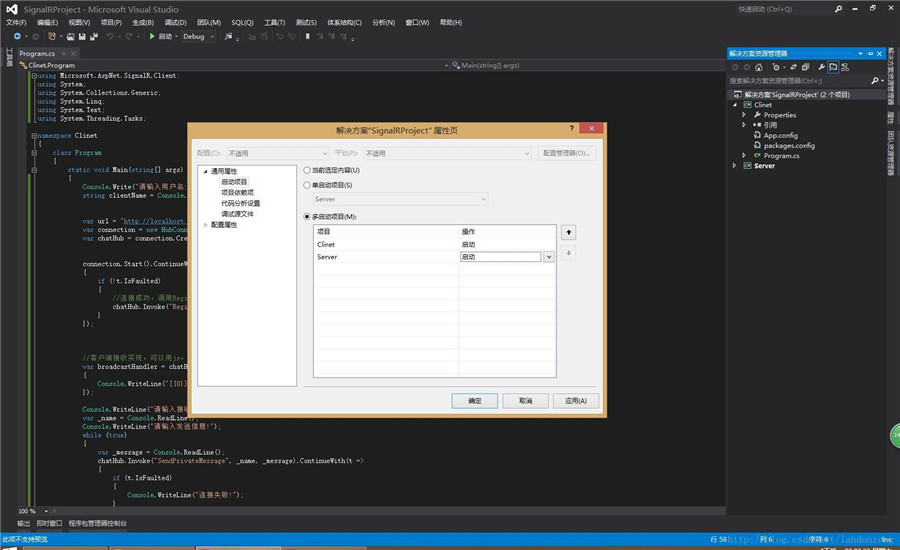 4、右键单击解决方案——>选择属性——>启动项目——>多启动项目——>将Clinet和Server设置为启动,如下: