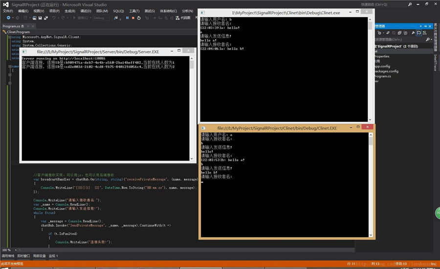 自此控制台调用SignalR服务端,实现消息推送的Demo就完成了,今天先写到这,下一章我们实现B/S端调用SignalR服务来推送消息