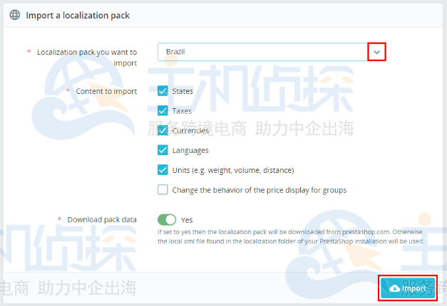 接下来,从列表和复选框中选择PrestaShop商店使用的信息,比如州、税、货币和语言等,设置完成后,点击Import导入包。