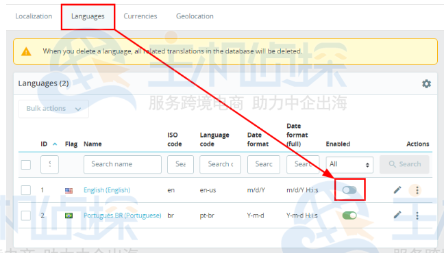 如果您想更改PrestaShop网站的默认语言,则可在语言选项卡下,点击对应的语言按钮,将其设为Enabled,并将其他语言禁用,这样您的PrestaShop网站将会加载该首选语言。