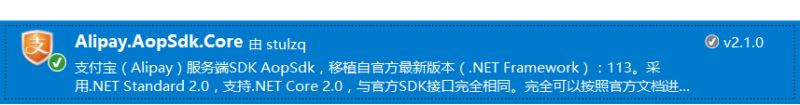 最近在使用ASP.NET Core来进行开发,刚好有个接入支付宝支付的需求,百度了一下没找到相关的资料,看了官方的SDK以及Demo都还是.NET Framework的,所以就先根据官方SDK的源码,用.NET Standard 2.0 实现了支付宝服务端SDK,Alipay.AopSdk.Core(github:https://github.com/stulzq/Alipay.AopSdk.Core) ,支持.NET CORE 2.0。为了使用方便,已上传至Nuget可以直接使用。