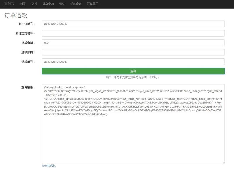 /// </summary>/// <param name="tradeno">商户订单号</param>/// <param name="alipayTradeNo">支付宝交易号</param>/// <param name="refundAmount">退款金额</param>/// <param name="refundReason">退款原因</param>/// <param name="refundNo">退款单号</param>/// <returns></returns>[HttpPost]public JsonResult Refund(string tradeno,string alipayTradeNo,string refundAmount,string refundReason,string refundNo){ DefaultAopClient client = new DefaultAopClient(Config.Gatewayurl, Config.AppId, Config.PrivateKey, "json", "2.0", Config.SignType, Config.AlipayPublicKey, Config.CharSet, false);