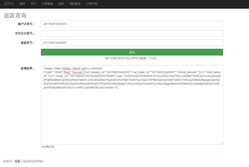 public JsonResult RefundQuery(string tradeno,string alipayTradeNo,string refundNo)