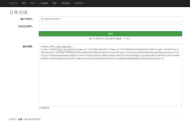public JsonResult OrderClose(string tradeno, string alipayTradeNo)