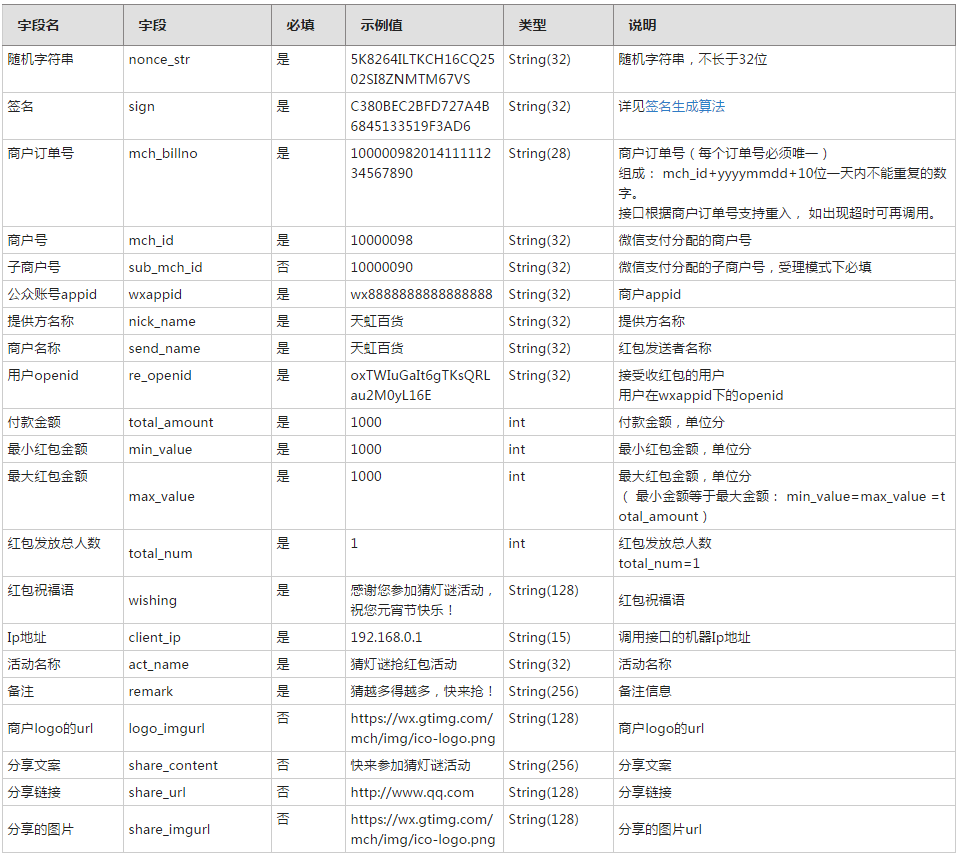 红包接口调用请求代码,所有请求参数为必填参数与文档对应: